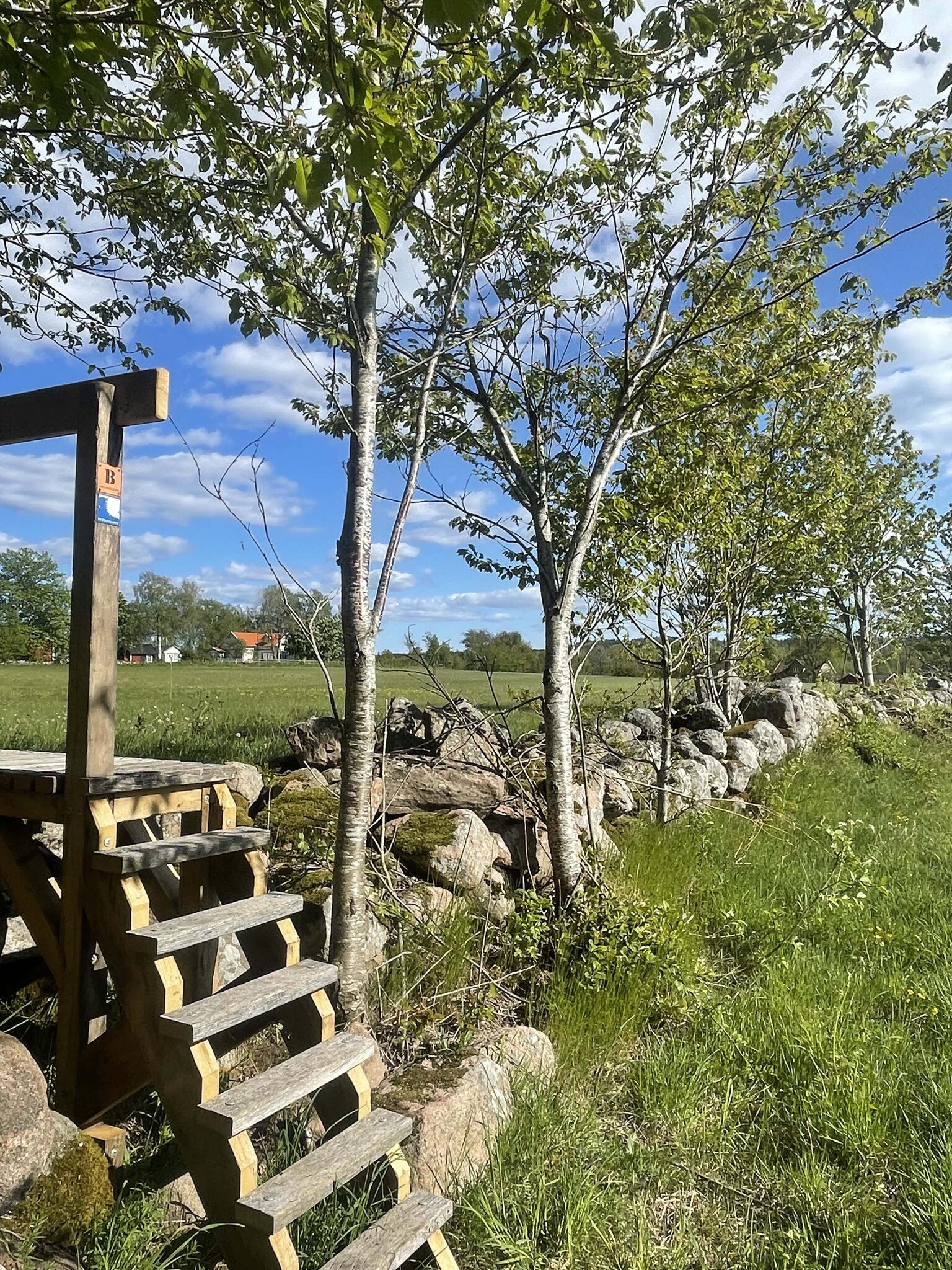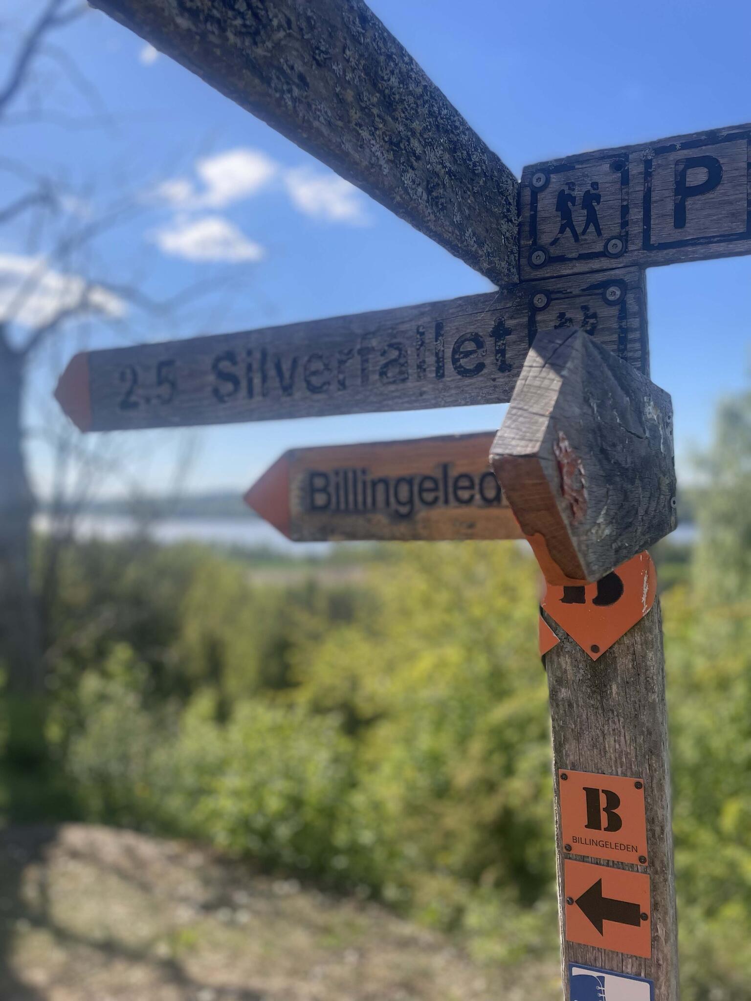 Vid Högsböla ängar hälsar jag på några vandrare som pausar och fikar i solen. De ska vandra hela leden, med övernattning i några av de enkla vindskydd som kommunen byggt längs vägen. Billingeleden är uppdelad i åtta etapper och passar bra för en flerdagstur – tre till fyra dagar om man vill gå hela vägen utan tält.