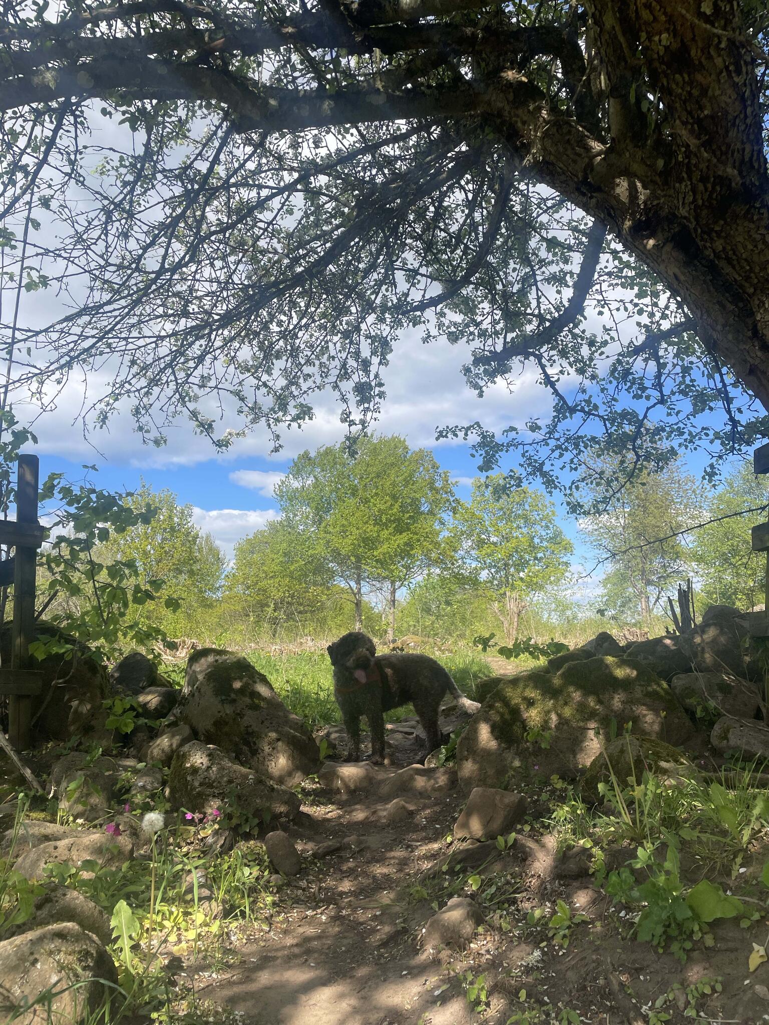 Många gånger klättrar vi över stenmurar, ibland får jag lyfta hunden. Fåren flyttar sig, korna följer oss med blicken men håller avstånd. Rut springer nära. Det känns tydligt att vi bara är tillfälliga gäster här.