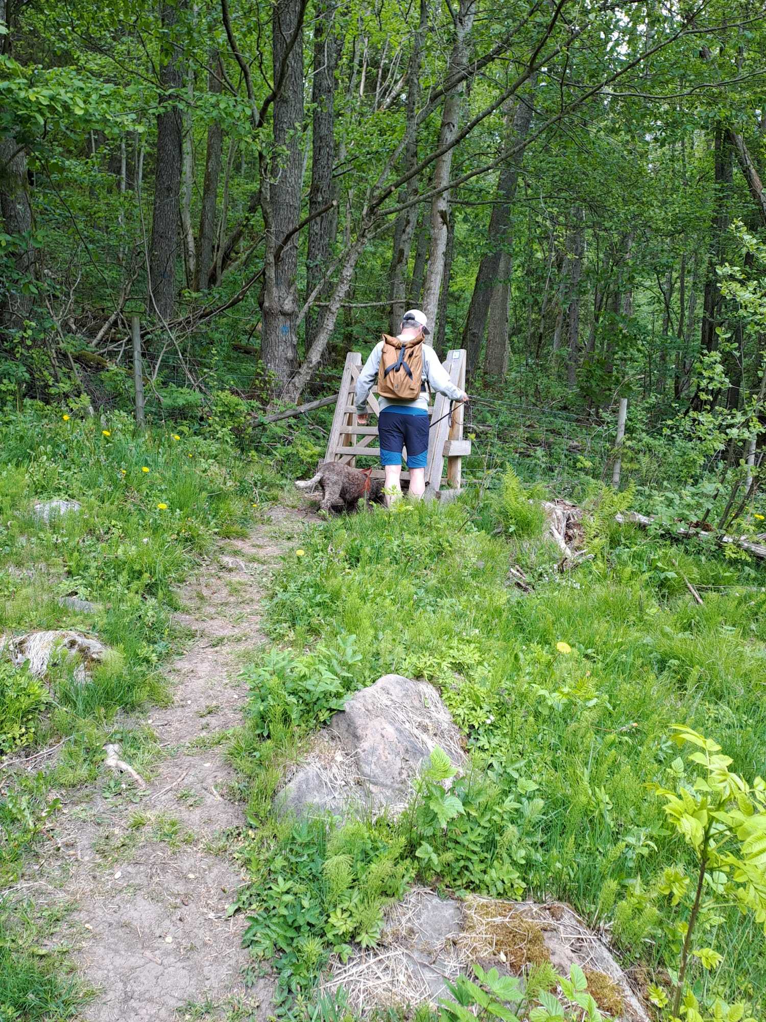 Det är nu dags att lämna vattenfallet bakom oss. Rut har druckit klart och jag har sett mig mätt på bergets geologiska lager. Vi fortsätter in på Billingeleden, markerad med röda skyltar och ett tydligt "B".
