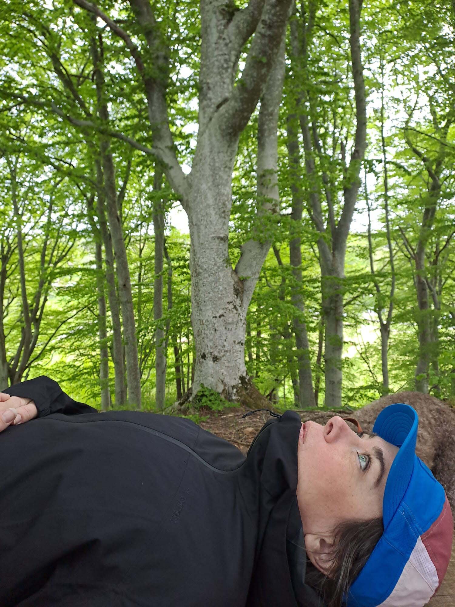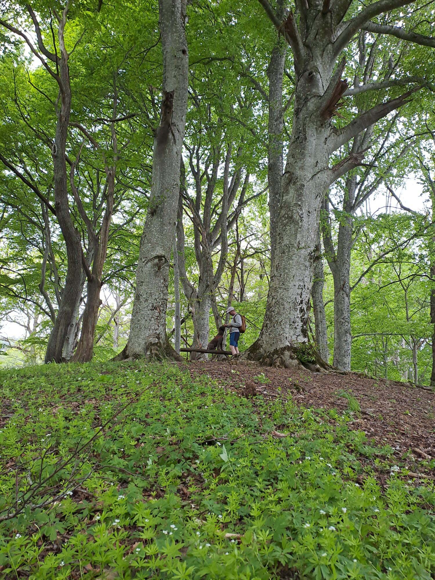 På toppen går vi längs bergskanten. Här finns flera bänkar och fina utsiktspunkter, men vi slår oss ner på en klippa täckt av mossa, omgiven av trädtoppar. Vi ligger på rygg på den mjuka mattan, kaffet smakar som bäst här.