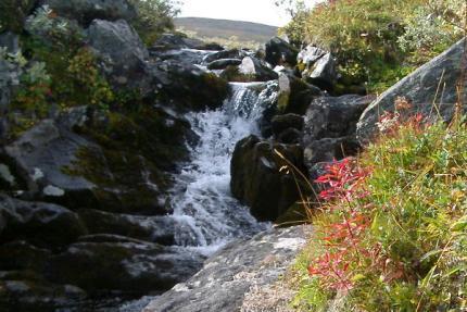 Under morgonen har jag hört ljud som lät ungefär som en motorväg på långt avstånd, men när vi gått en bit förstår jag att det är alla små forsar som finns utefter fjällsluttningen, som låter. Efter att ha vandrat ca en halvtimme och jag upplever att det är betydligt jobbigare att gå i dag än i går, så tar vi en kort rast vid en av alla dessa forsar.