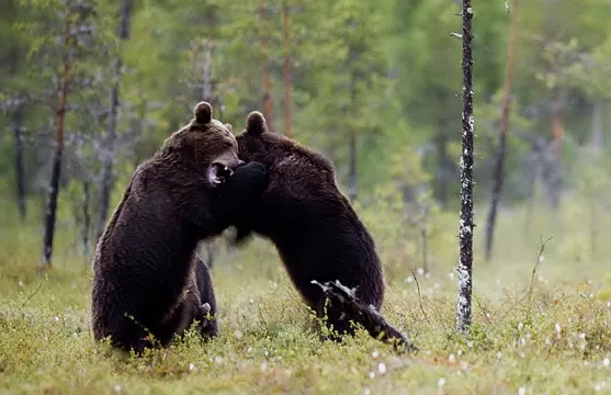 Det var en magiskt natt i mitt fotogömsle i slutet av juni. Dimmorna dansade över den vackra myren bland myrtallar och blommande tuvull.Och som pricken över i så lyckades jag mitt i den ljusa sommarnatten få några bilder på 2 björnar som slogs. Så när solen började att varma i den tidiga morgonen så sommande jag mycken nöjd med ett leende på läpparna. Detta var en naturupplevelse som jag aldrig ska glömma.