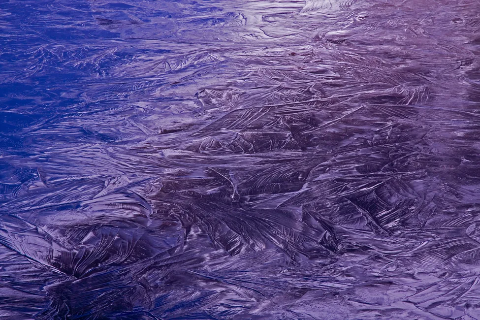 Vid en vandring mellan Abisko och Nikkaluokta i september passerade jag det högalpina passet mellan Kebnekaisemassivet och Kaskasatjåkka. På den lilla sjön - Kaskasjaure - vid Kaskaspakte södra fot hade isen redan lagt sig. Det kraftfulla mönstret i isen framstod mycket tydligt i släpljuset vid solnedgången. Skuggan från de omkringliggande bergen gav upphov till kraftiga ljus- och färgskiftningar i isen. Med 105 m m brännvidd gick det att få de vackra ismönstren att framträda ordentligt trots att jag stod uppe på strandbrinken.