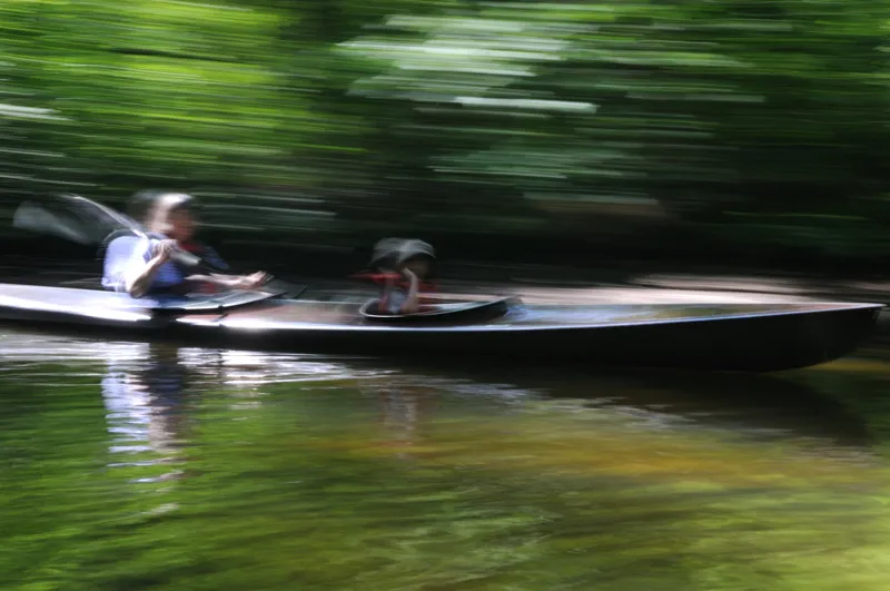 Premiärtur med barnbarn i 30 år gammal VKV Anita K2-kajak. Spännande å i en tunnel av sommargrönska.