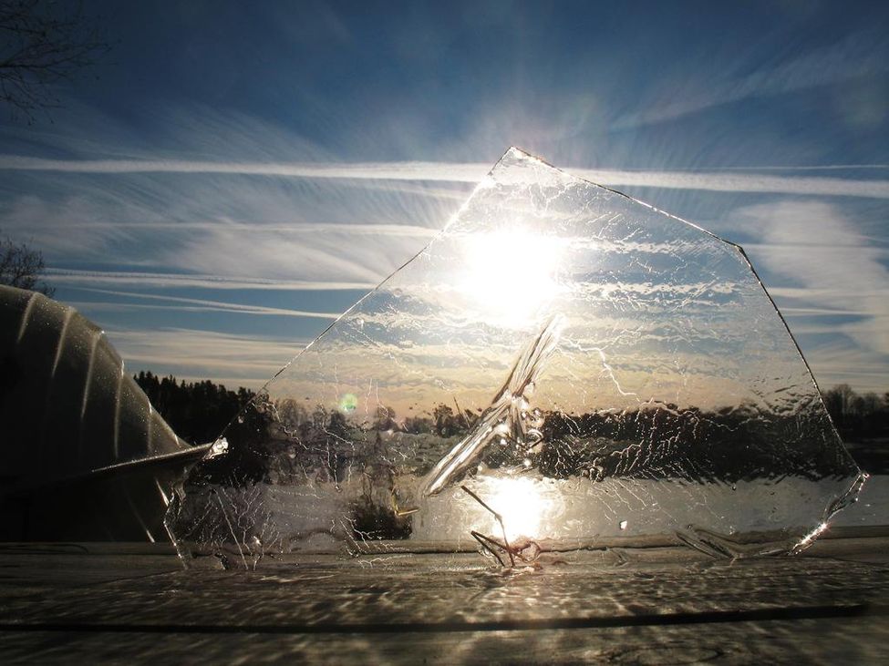 Den första isläggningen över Hjärtasjön. Isen är några mm tjock efter en kall natt. Jag fäste en isbit i den uppdragna bryggan på land och tog en bild genom isen mot den bleka vintersolen.