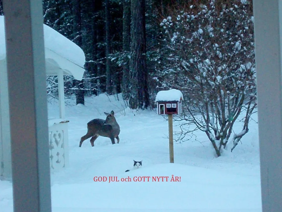 Vår sons flickvän, tog detta foto i december. Hon lagade mat i köket och utanför sprang 3 rådjur. 2 av rådjuren gömmer sig bakom lekstugan. Katten är helt oberörd av rådjuret. Sonens flickvän är från Schweiz och blev så glad över att se rådjuren på nära håll. Rådjuren ville säkert hitta något gott i trädgården.