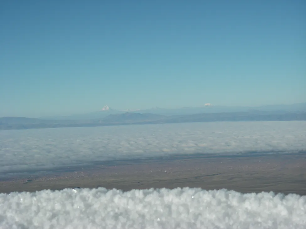 Snö som ser ut som moln, och moln som ser ut som snö. Snö på hög höjd i förgrunden, nedanför breder ett täcke av moln ut sig, för att ännu längre bort genomborras av snöklädda toppar