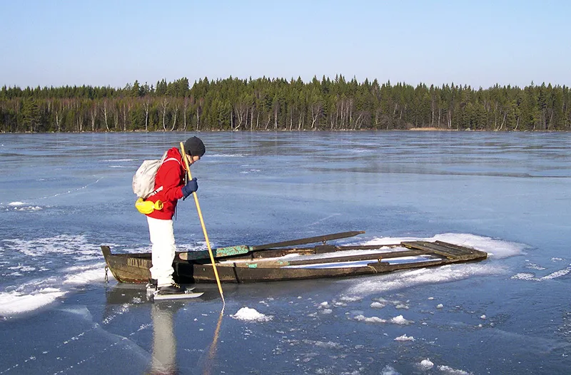 Min fru och jag åker långfärdsskridskor och hittar denna infrusna båt i isen på sjön Hindsen.