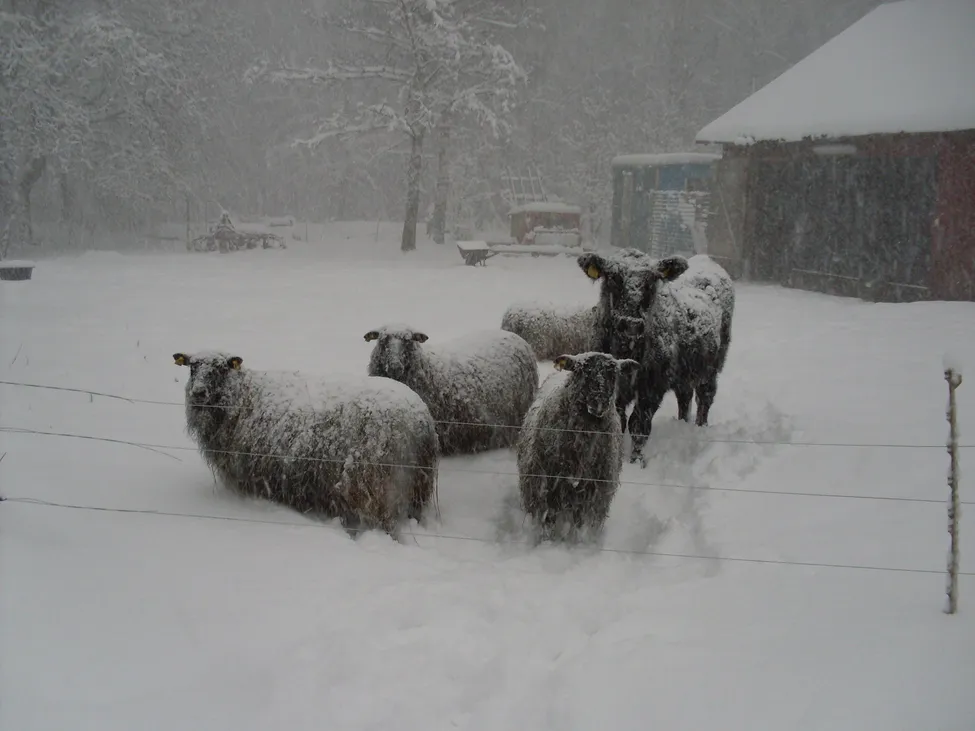 Mina får och min kviga väntar på maten. Det finns inte så mycket att tugga på ute.