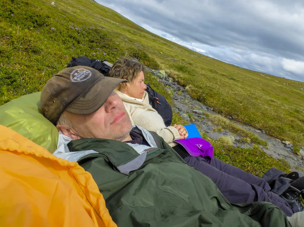 Efter en svettig vandring från Revlingesjöarna och Rönsjön hamnade vi efter två dagar nedanför Salsfjället för en tupplur efter lunchen som bestod av omelett gjord på egentorkade ägg mm.