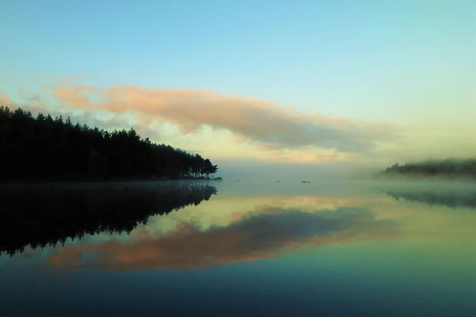 Dimma över sjön Nävsjön på en tidig höstmorgon