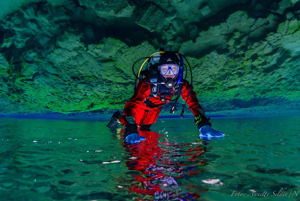 Min vän Patrik Leonardsson poserar i förkastningsspickan Silfra på Island. En bild som kräver mycket av både fotograf och poserande dykare! Bilden är vänd upp och ned!
