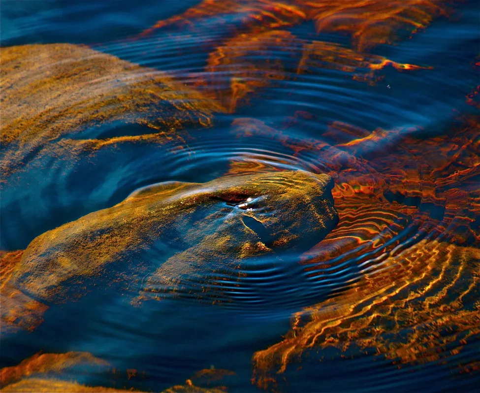 Det skulle kunna vara en padda som sitter där under vattenytan men det är en sten som fått liv.