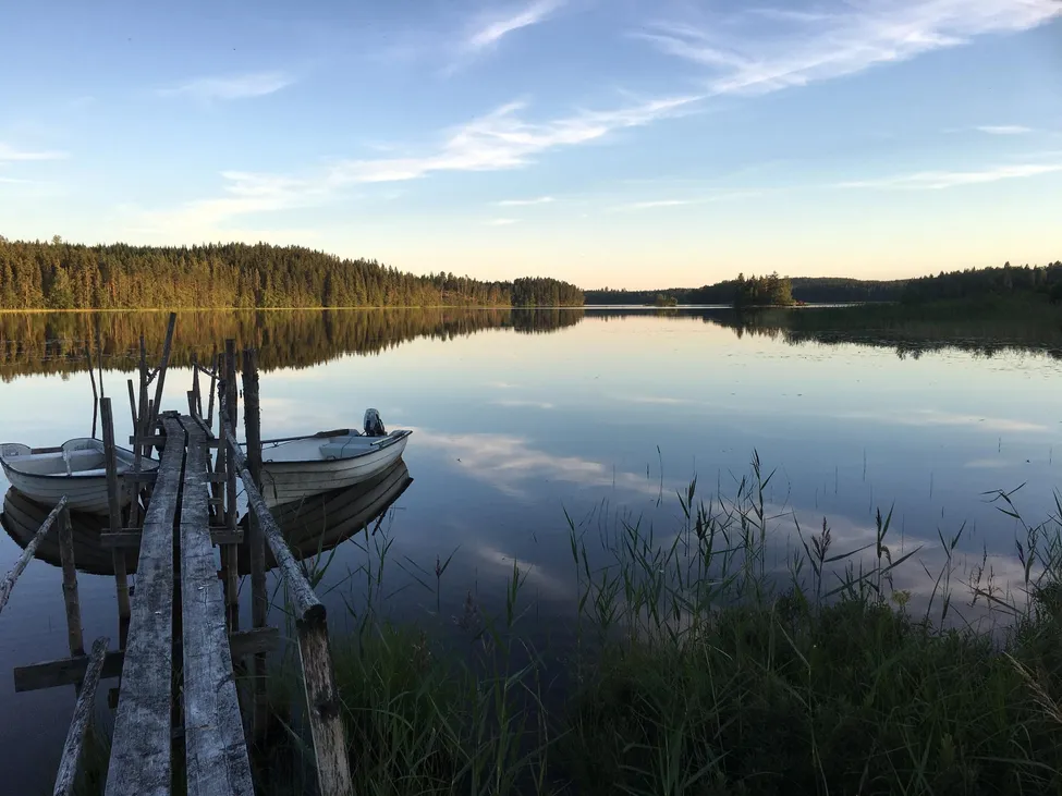 Sjön Grängen ligger spegelblank på morgonen. En av båtarna kommer under dagen leverera ett personbästa på abborre, 1,4 kg...