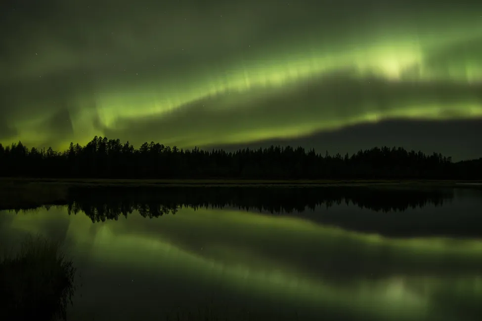 Härligt norrsken som speglade sig i den spegelblanka lilla Svartåtjärnen.
