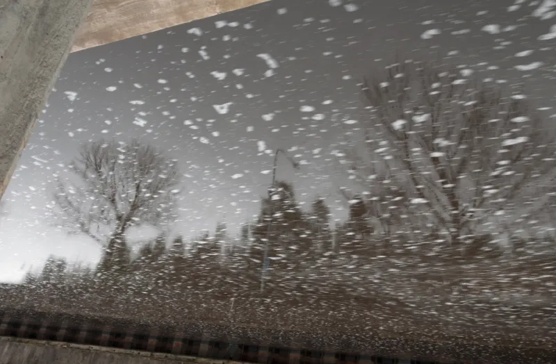 Skummet på ytan tyckte jag blev spännande bland träden. Jag har vänt på bilden, och stenkanten är betongen från kajen.