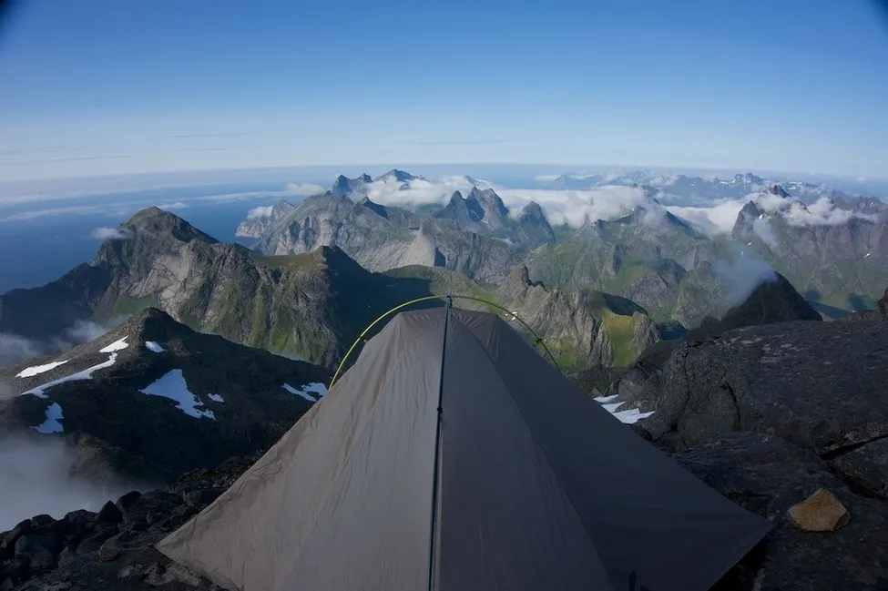 Årets bästa tältplats på toppen av Hermanndalstinden i Lofoten med svårslagen utsikt! Fick precis plats med tältet :) (Lightning 2 FL från Sierra Designs)
