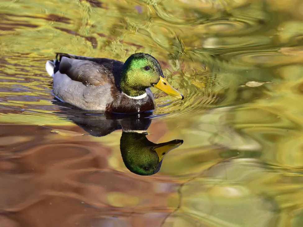En gräsandshane glider runt i vattnet som är vackert färgat av höstlöven på de intillstående träden.