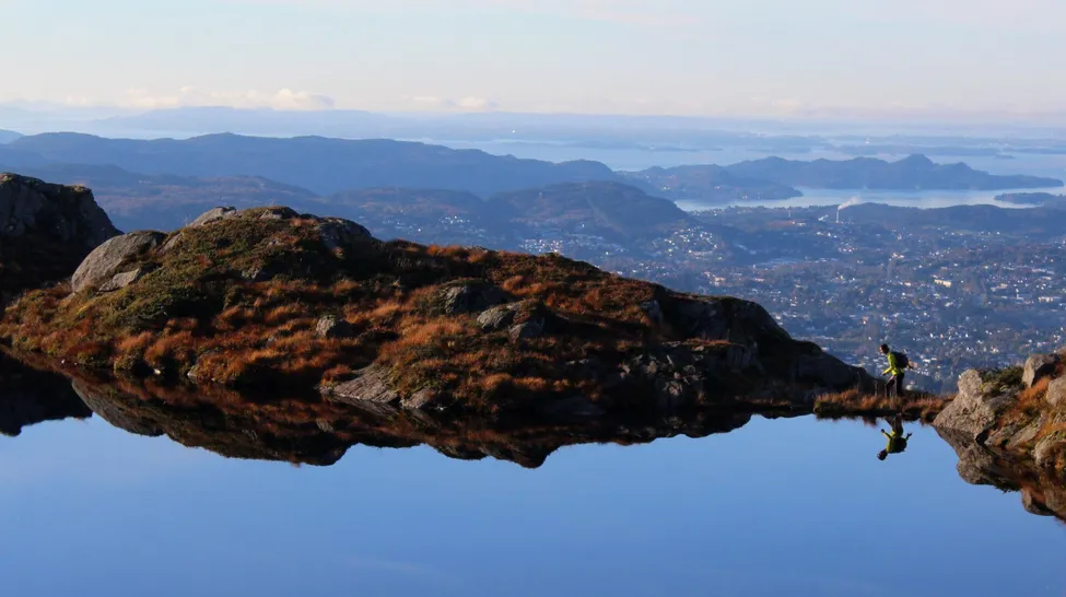 En perfekt höstdag på Ulriken. Här syns Göran springandes med staden Bergen och havet i bakgrunden.
