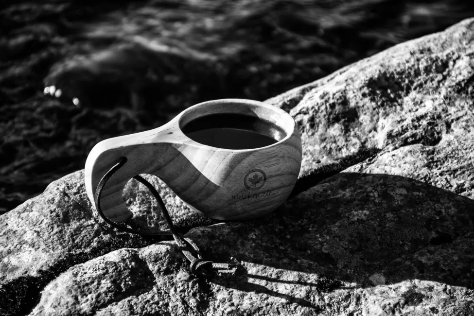 Kaffe i träkåsa vid Storulvån en tidig höstmorgon.