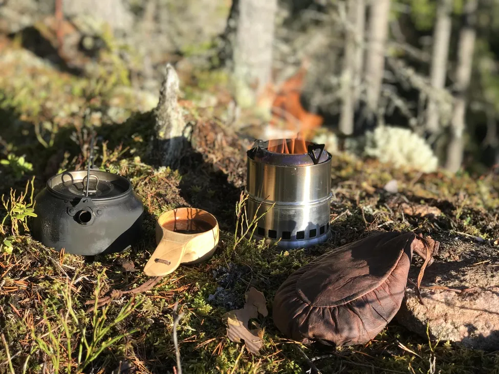 Kokkaffe ska väl egentligen göras på björkved men idag blev det på vedgasköket och nog smakade det bra ändå.