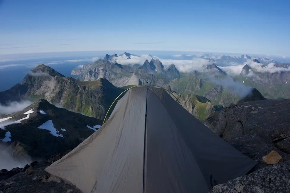 Kanske en av de vackraste utsikterna jag upplevt. Ont om plats att sätta upp tältet men kunde inte motstå den magiska omgivningen av bergstoppar och hav. Lofoten är en fantastisk plats och det är värt att åka dit bara man får en toppbestigning med fint väder, mer behövs inte.