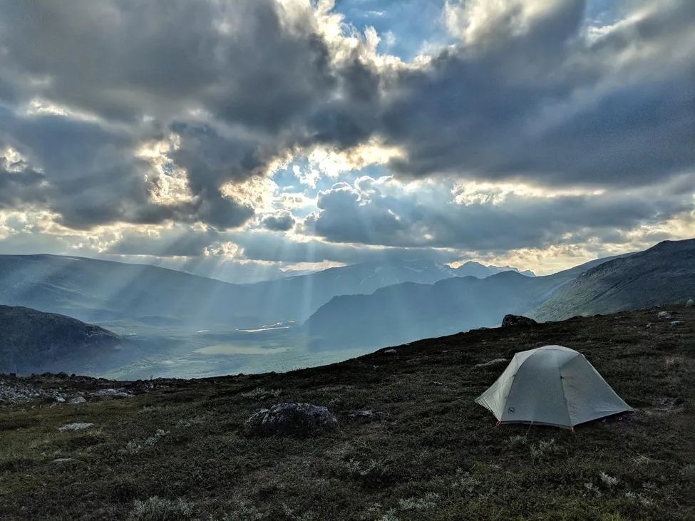 En del av min cykel- och vandrings-resa genom Sverige och Norge var vandring av kungsleden. Vid Aktse vek jag av för att göra en omväg genom Sarek, men först några dagars vila för att inflammationen i en låret skulle lugna sig. Jag hittade en plats längst ut på "hyllan" nordväst om Skierffe och la mig där 3 dagar. Som du ser så var det ett lyckat val 😁 Molnen över Sarek bjuder på många häftiga ljusshower och den här var en av dem.