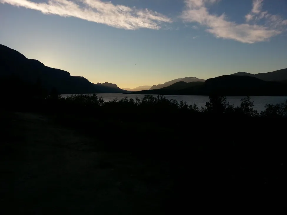 Solens strålar skiftar färg på berg, vatten och landskap.