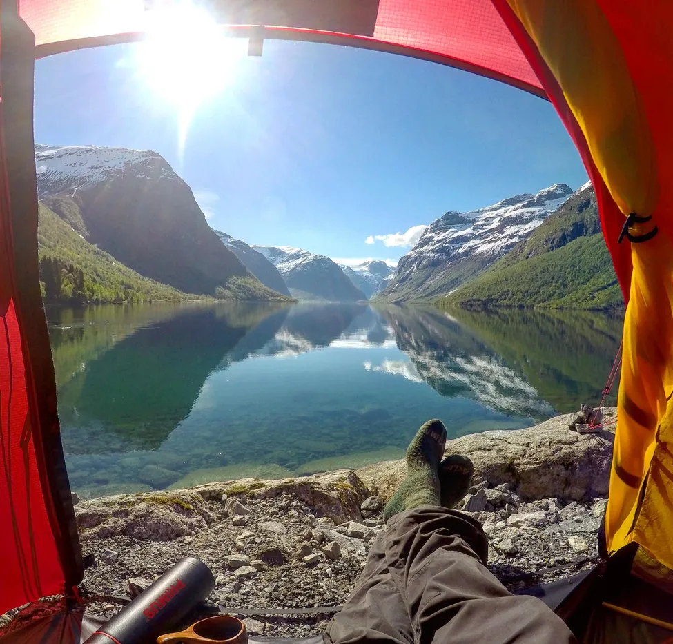 Vilken härlig morgon vid Lovatnet. Njutbar utsikt, kanske finaste jag upplevat. Piggar till med lite morgonkaffe inför dagens kajaktur på sjön.