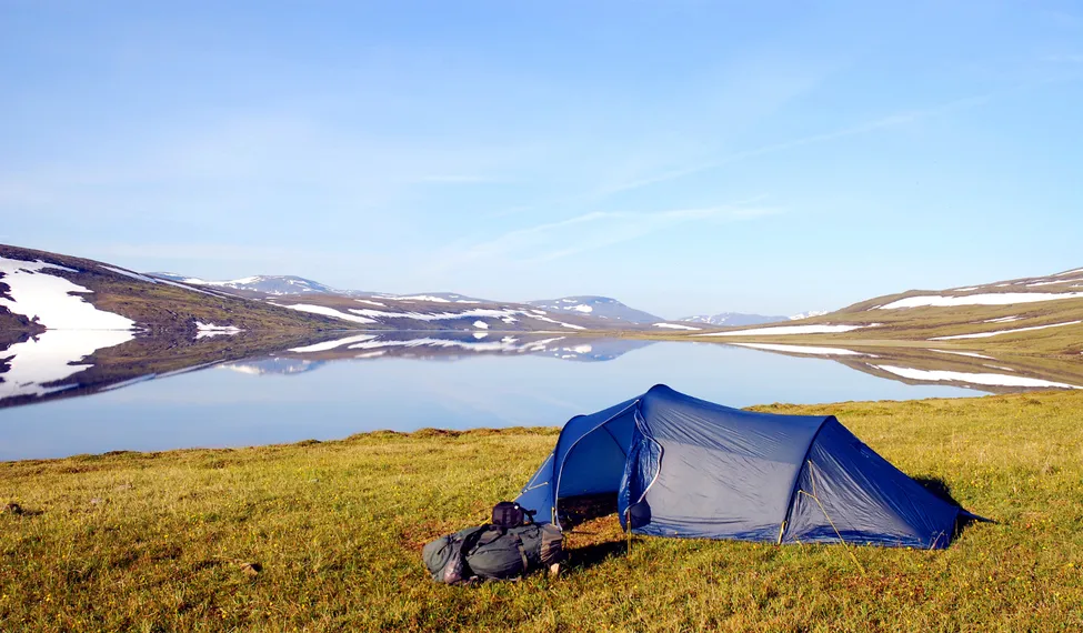 Denna bild tog jag på min ensamvandring i Badjelannda nationalpark sista veckan i augusti 2015. Normalt brukar det vara lite höst i luften och inte så varmt i slutet av augusti men denna sommar var helt annorlunda. Snön låg kvar i tjocka lager långt in i juli och den riktiga värmen kom andra delen av augusti. Det var 25-27 grader varmt på dagarna och helt vindstilla vilket gjorde det hett att vandra. Renarna led av värmen och låg mest och vilade på snöfält. Jag svettades och gick och plågades också en hel del av mygg. Men vackert var det!