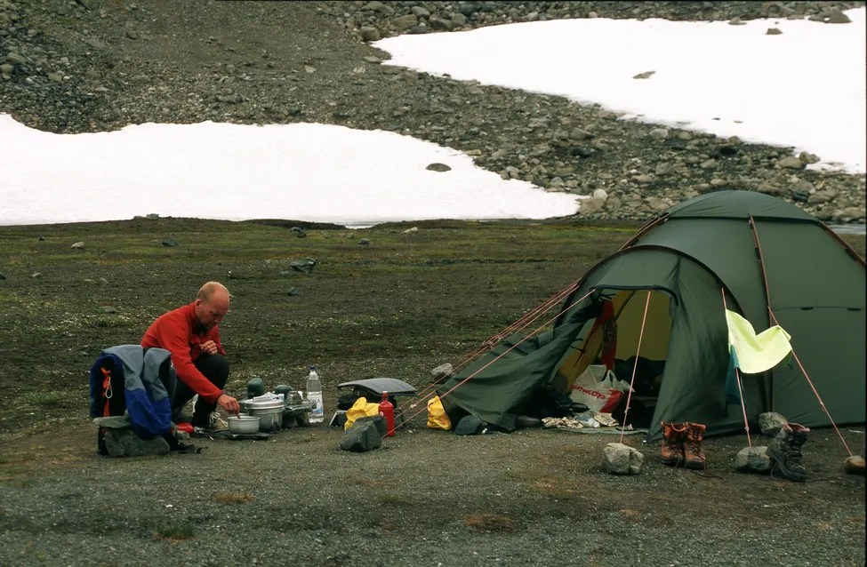 Läger nära Storglaciären i Tarfala. Tältplatsen ligger nära Storglaciären. Man kan komma till de klassiska klätterlederna på Kebnekaise genom att gå över Storglaciären eller Isfallsglaciären härifrån.