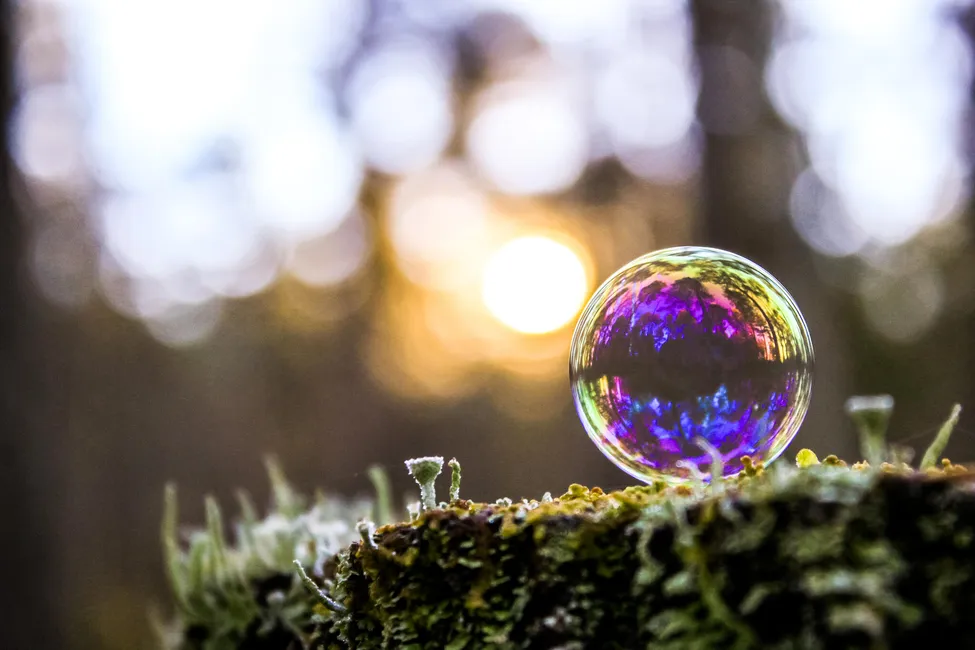 En såpbubbla i gryningsljuset reflekterar ett mönster av skogen i bubblan