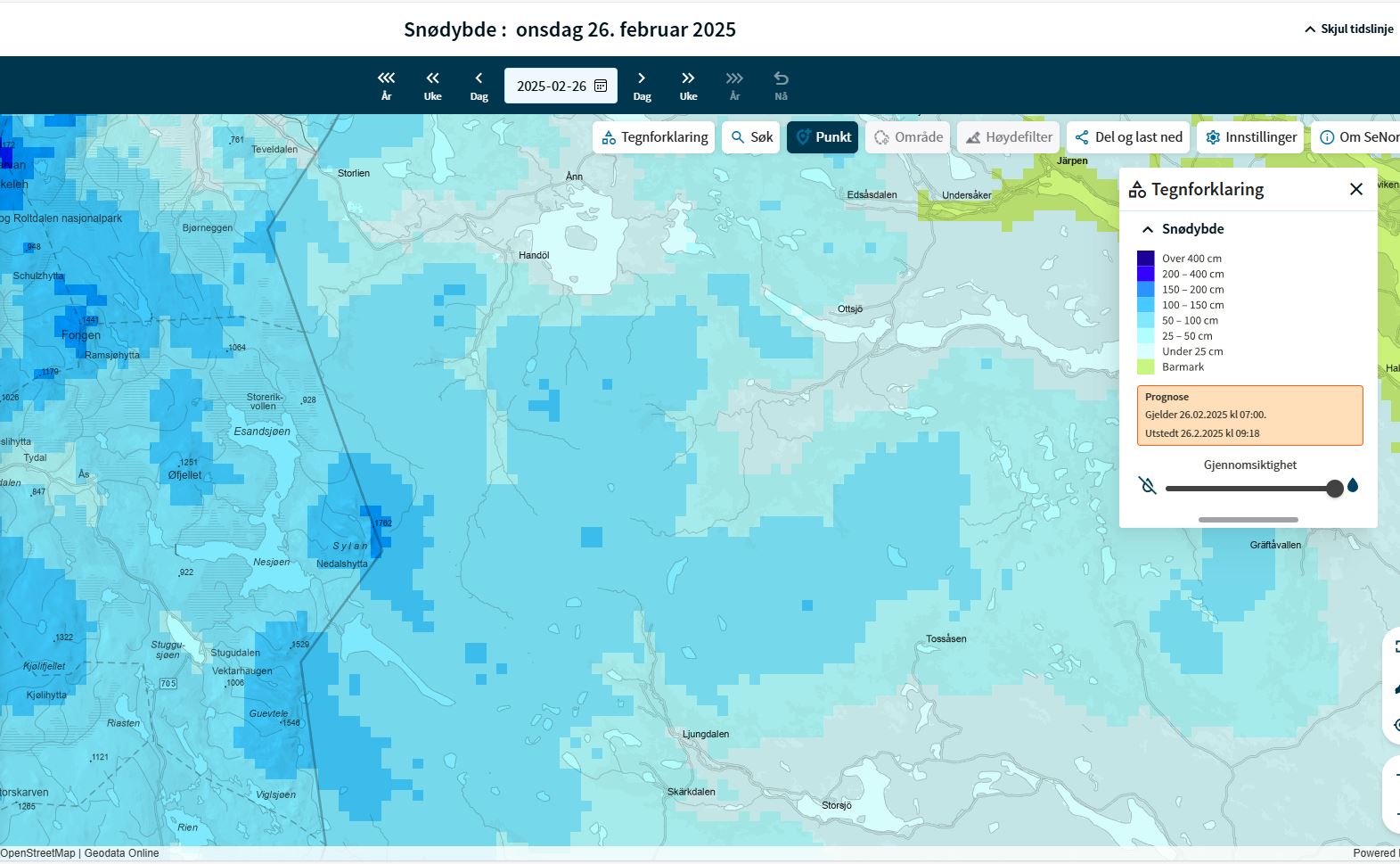 I skrivande stund är det klent med snödjupet på många ställen utmed ledsystemen. Bra info på karta kan man få på den norska siten SeNorge se aktuella skärmdumpar.