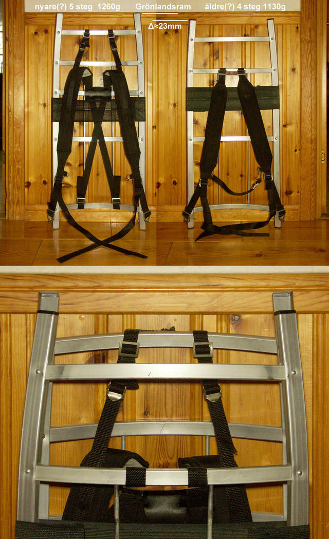 De jag har här är dock bara ~23mm olika långa?!? Och har 5 respektive 4 tvärsteg i ramen (alla olikheter återfinns i den övre halvan av ramen, se bild). Den längre väger (med axelremmar och nätstöd) 1260 gram medan den kortare väger 1130 gram... (Den längre är strax över 86 cm.) Jag vet att den kortare sannolikt är äldre (baserat på bärsystem och bälte), men i övrigt? Är det någon som har något att bidra med här? Jag är fundersam/nyfiken...