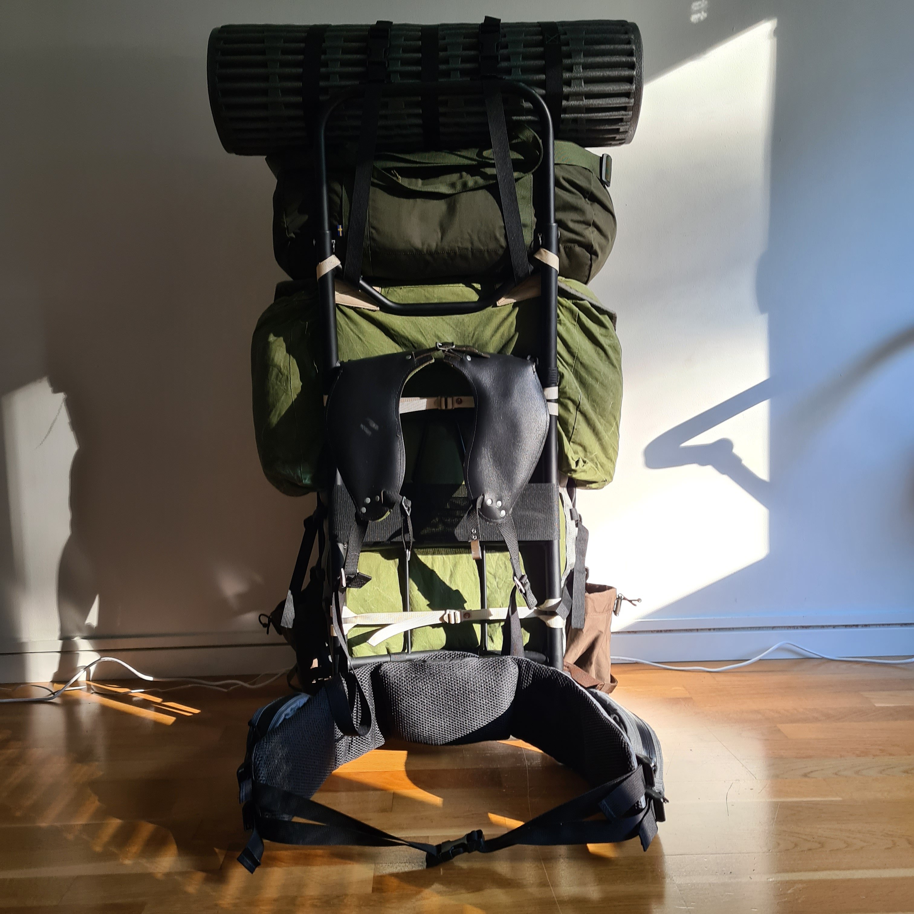 Snyggt! Kul att den hitta hit till denna tråd.Tibet gyro 80 L. ”Sverige-säcken” 😁. Delbar. Öppning med dragkedja och knappar nedtill. Modernare axelremmar.