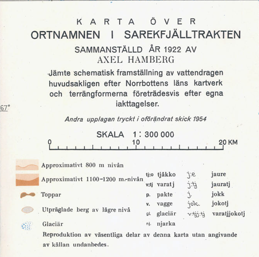 Här finns kartan som jpg - HambergSarekKarta1922.jpg (2000×2429). Den är fortfarande oöverträffad, titta på teckenförklaringen längst ned till vänster på kartan:I sammanhanget vill jag påminna om Hambergs karta. Den visar inte stigar och färdvägar men visar terrängförhållandena bättre än generalstabskartan. Den var länge den bästa Sarekkartan. Hamberg tog fram kartan efter att ha rest till vintermarknaden i Jokkmokk och träffat tillresta samer. Ortnamnen är skrivna med "svensk" fonetik för att bästa möjliga sätt återge jokkmokkssamernas/lokalbefolkningens sätt att uttala ortnamnen.