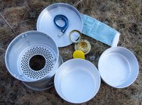 Ett tidigt Trangia i nyskick, inkl bruksanvisning och allt. Kastrullhållarna gjorda av tråd, plastlock till brännaren, tamoj utan hål och ringen för sparlåga fäst med gångjärn. På undersidan av kastrullerna syns att de blivit utsatta för spriteld, men det är nog bara en enda gång. Inget sot eller så.