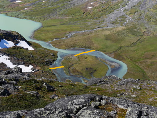 Efter sommarens övningar, och baserat på att jag försökte läsa in mig på detta vad här på utsidan innan vandringen, så hade jag tänkt att dela med mig om hur vi tog oss över Bierikjåhkå lätt och ledigt. Det var sand och smågrus i botten och inte särsklt snabbt vatten, som mest knappt knädjupt. Vi gick över en strax efter utloppet ur sjön, bild från sluttningen av Bierikvárásj: