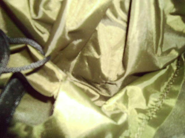 När jag kollar mellan väggen till sovsäck facket så hittar jag två revor av någon som har skurit med kniv.