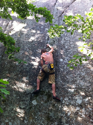 Det är West Crack på Daff Dome i Tuolumne Meadows. Grad 5.9, klättraren är Bogi Palfay, året är 1996.