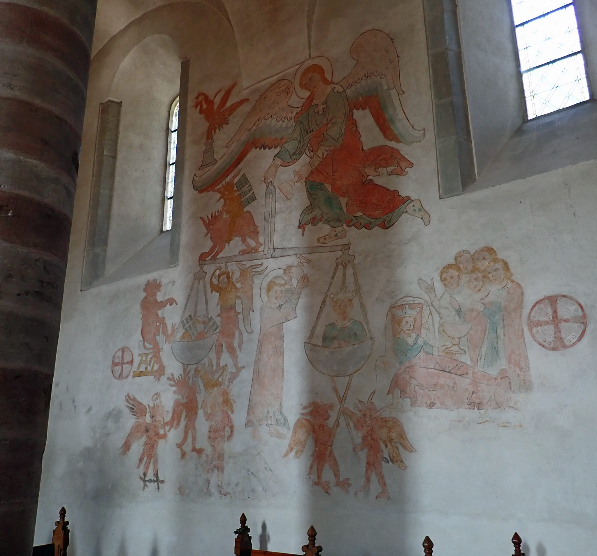 Det är den kända "kejsar Henriks själavägning" som lär vara Gotlands största bevarade medeltida kalkmålning. Vamlingbo kyrka är rätt. Här finns också en gravsten med en träffande formulering ett memento mori.