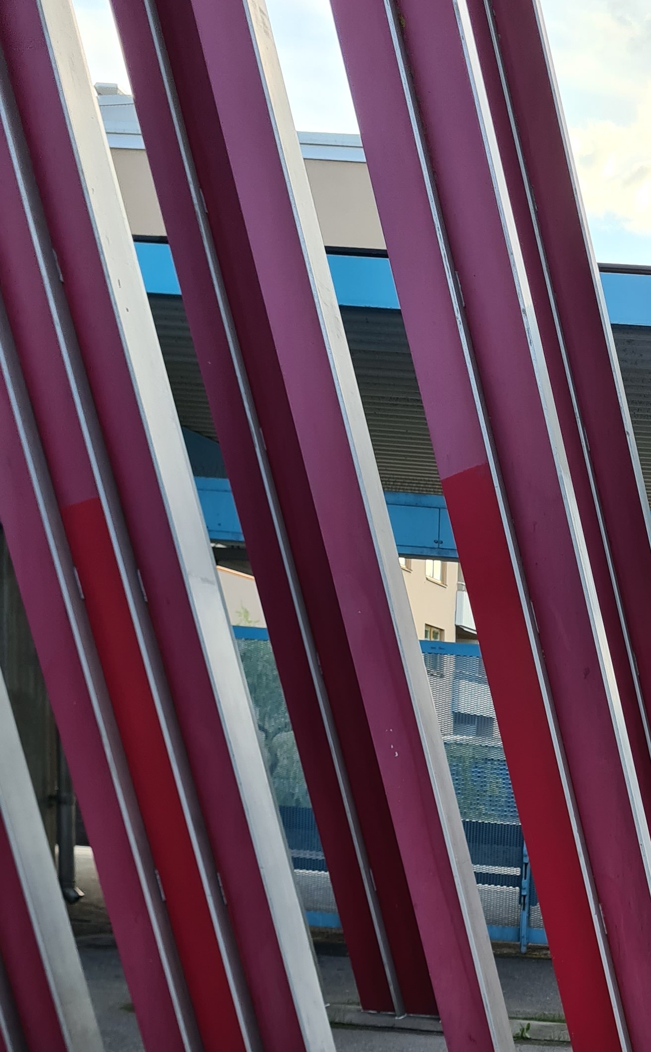 "Två skulpturer i målat aluminium är placerade i utrymmet mellan busshållplatserna. De har exakt 73 graders lutning och just den lutningen är viktig för konstnären Lars Erik Falk. Under många år har han fascinerats av och arbetat med skulpturer med 73 graders lutning. Enligt konstnären är det den vinkel som gör att skulpturen varken är statisk eller fallande. Med sina skulpturer bryter han av ett rums räta vinklar och ger det spänning. "