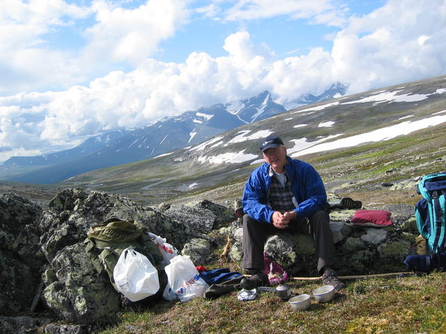 Kalle var först. Det är mycket riktigt Kåtoktjåkko-Piellorieppe i bakgrunden. Kortet är taget nästan högst upp i Vassjavagge. Det är första lunchen på vandringen så därför blev det lite ostrukturerat.