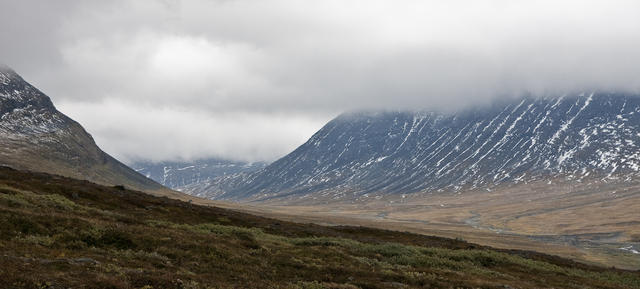 Jag tror att vi ser krokarna norr om Rinim. Den lilla knallen långt bort till vänster i bild torde vara Namadis, väggen tvärs över det som då är Sitoädno är Guravarasj, massiven i bakgrunden är Dakartjåkkå till vänster och Ruopsoktjåkkå till höger, och ravinen i förgrunden är Vuovresjågåsj.