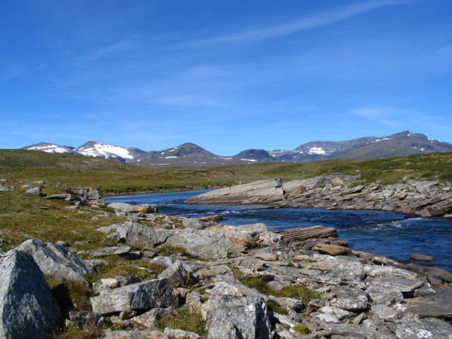 Lijggebuoldajågåsj flyter fram så där fridfullt uppe på Låvdakvarddo. Fjällen i bakgrunden skulle då vara de söder om Guohpervagge. Jag får dock inte bakgrunden att stämma mot kartbilden.