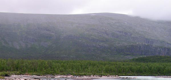 Den obeskurna bilden visar Rapaälven som i högsta grad är oreglerad men vars stränder kan likna en reglerad sjö p.g.a. vattenståndets variationer.