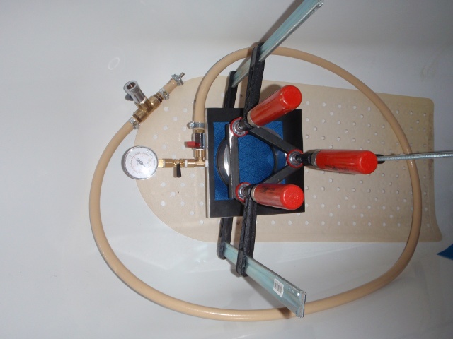 De verkliga testriggar jag sett bestod av botten med hål i, gummiduk, provbit, gummiduk, vatten och tryckrör. Allt monterat ihop med maskinskruvar. Ca 30 cm högt. Bra manometer och pump löste resten. Hink under kan säkert spara en och annan blöt upplevelse.
