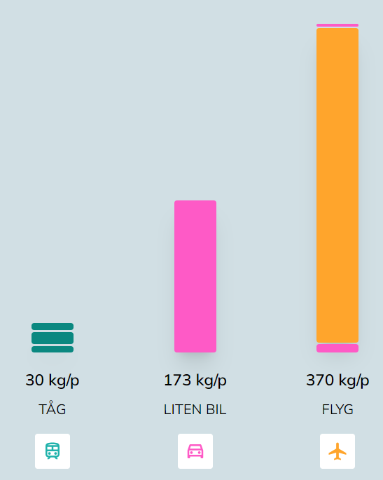 En liten bensinbil hade i stället "kostat" 578 kg/p, dvs långt mer än flyget!