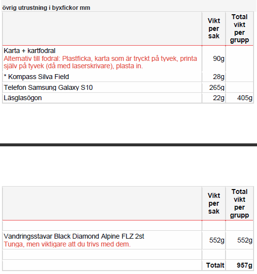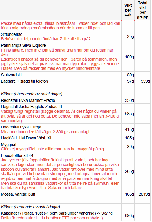 - lättpackning packlista