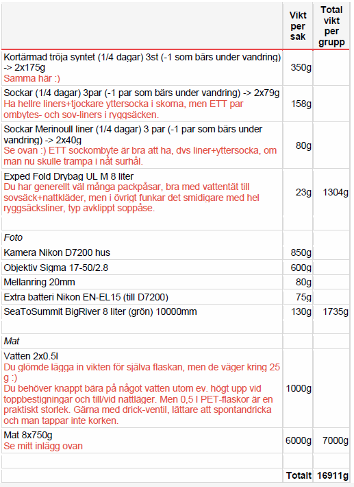 Det jag tar till mig mest som du och kimkim varit inne på är att sovsäcken kanske inte är tillräckligt varm och skall jag optimera på något annat så är regnstället det jag kan tjäna mest vikt på.